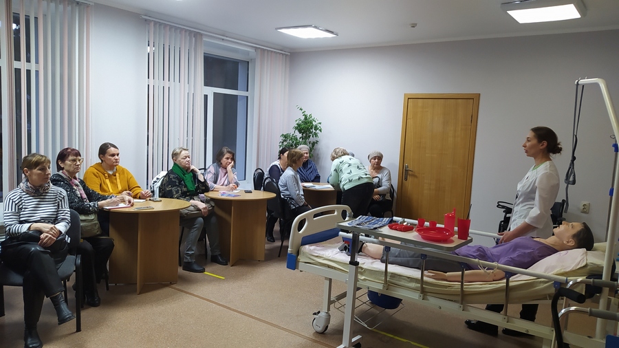 На очередном занятии в «Школе ухода» с участием медицинской сестры ГБУЗ «Пензенский областной госпиталь для ветеранов войн» Мягковой Екатерины Викторовны рассматривались вопросы по теме «Гигиена маломобильного человека, проведение гигиенических процедур, вспомогательное оборудование».