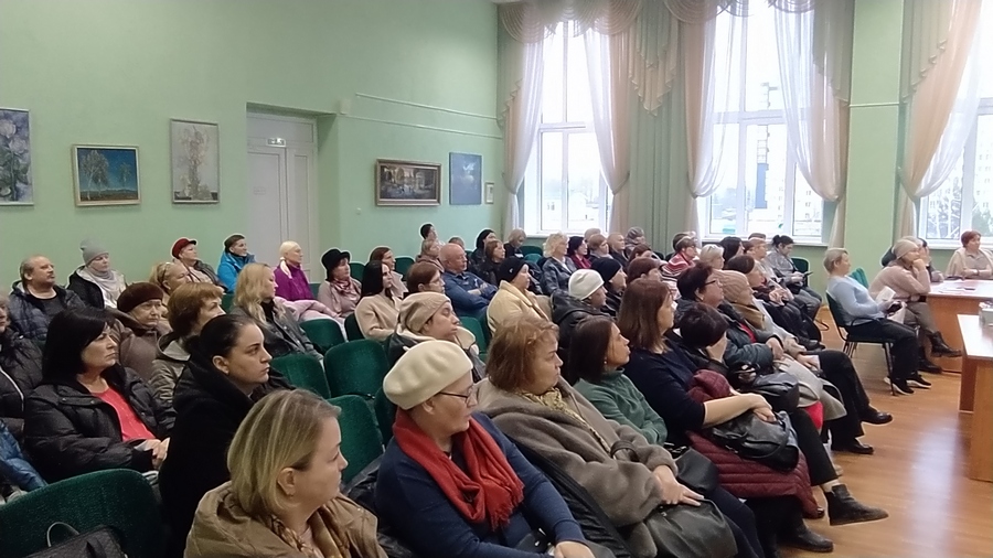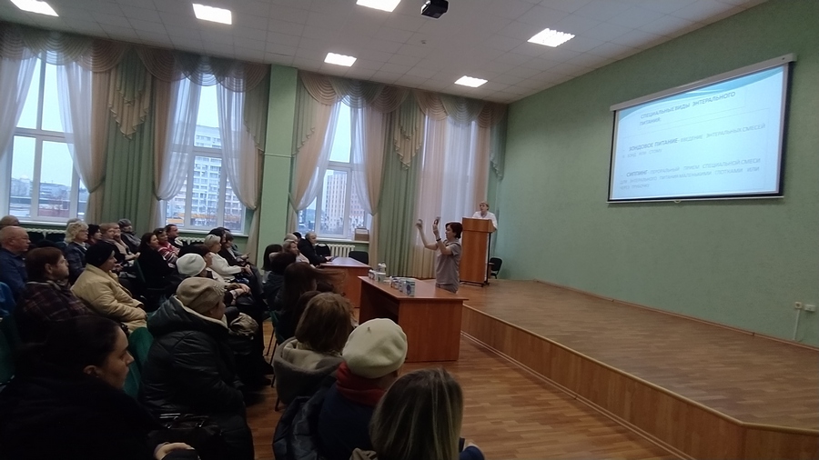 Медицинский работник рассказала присутствующим о принципах питания людей с ограничением самообслуживания, симптомах недостаточности питания, об основных правилах кормления тяжелобольного, об организации места приема пищи. Слушателям даны рекомендации относиться к больному человеку с пониманием, а также стараться создавать доброжелательную обстановку во время приема пищи, периодически вносить изменения в меню, чтобы питание было разнообразным, сбалансированным и стимулировало аппетит.
